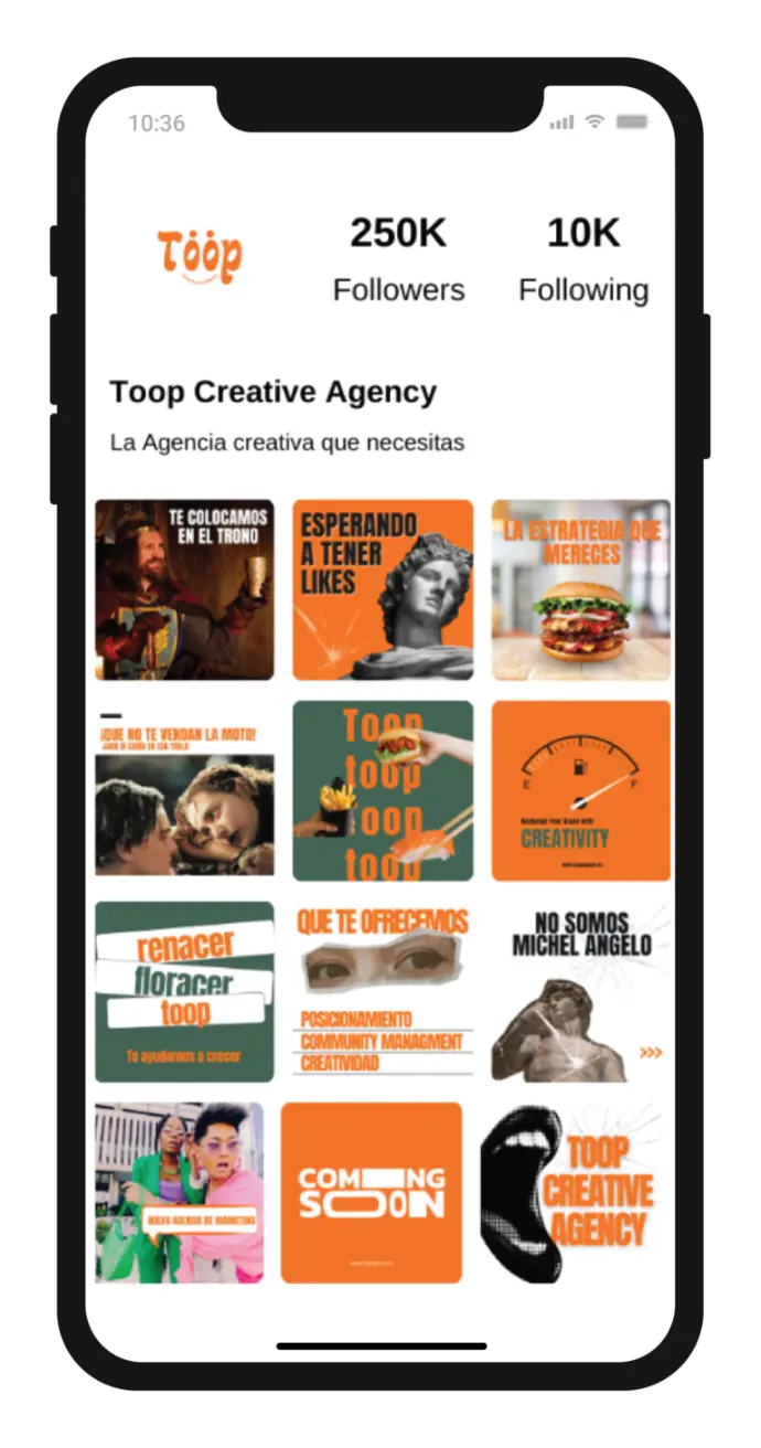Ya sea que estés buscando una estrategia de marketing digital innovadora, campañas publicitarias impactantes, diseño gráfico de vanguardia o una presencia en redes sociales que destaque, Toop Creative Agency tiene la experiencia y la pasión para hacerlo realidad.